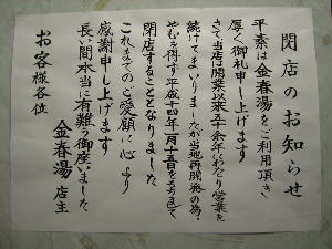 | 久しぶりに訪れたら、廃業のお知らせが… なんでも再開発のためにやむなく廃業とか。すべすべの湯とカラン、シャワーまでも黒湯のhiroのお気に入りの銭湯だったんですが。とても残念なことです。廃業までにもう1回行っておこっ! 最後の湯を楽しもうと、1月に2回ほど湯に浸かってきました。最後の休日、成人の日には最後の湯に浸かろうという人でいっぱいで、カランで体を洗うのも順番待ちと行った状態でした。最終の15日は無料で開放するとのことでした。きっと、たくさんの人が訪れたんだろうな? |