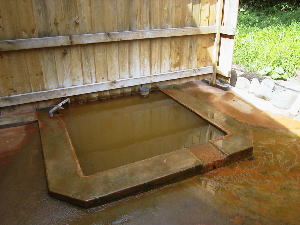 | 最近できたという露天風呂です。新しいわりにかなりの堆積物が湯船のまわりについています。湯の成分が濃いのかもしれせん。 湯上がりにはけっこう汗が出て、なかなか服を着ることができませんでした。 |