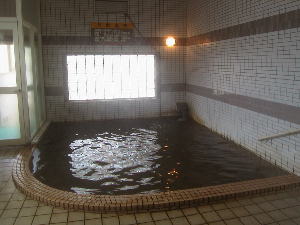 | 洋室は縦長で、そんなに広くはありません。一番奥にけっこう大きめの湯船があります。さっそく湯に浸かろうと湯船の前に行くと、ちょっと立ちすくんでしまいました。今までに見たことのない湯に色だったんです。うまく表現できませんが、濃い灰色に茶色を混ぜたような色です。これが温泉と分かっていなければ、退いてしまいます。湯は適温で、すべすべ感があります。黒っぽい湯の花も浮かんでいました。湯口の湯を飲んでみると、いい塩梅の塩加減。なかなかおいしかったです。 |