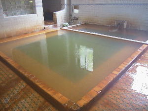 | 元々は混浴で使われていた大浴場。現在は男女別になって、男性用の浴室となっています。無色透明の湯がドバドバとかけ流しになっていますが、湯船では赤みを帯びた緑色に変わっています。湯口に近い方がちょっと熱め。けっこう深い湯船で、立つと胸ぐらいまであります。湯を飲んでみると、鉄分を感じました。 |