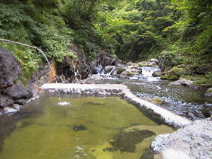 | 宿からちょっと離れたところに有名な川沿いの混浴露天風呂があります。一応男女別に脱衣所もあるのですが、湯船からは離れているので、裸で湯船まで歩いて行かねばならず女性にはつらいかも。 湯船は広く、ゆったりと湯に浸かることができます。けっこう熱めの湯ですが、広い湯船の中で自分好みの場所を見つけるのも楽しいもの。川の流れと、ときおり鳴くセミやカジカの声を聞きながらの湯は最高でした。しばし、時間を忘れてぼーっとしていました。 |