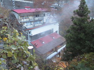| 浴室は建物の一番下にあります。脱衣所から浴室に入ると、湯気で浴室の中を見渡すこともできません。湯船の縁まで行くと、堆積物が厚く、そして固くこびりついていました。そして、うたせのように落ちている湯口まで行くと、壁には山のように堆積物が盛り上がっていました。かなり成分が濃い湯なのでしょう。赤さび色の湯と堆積物のすごさから北海道の二股ラヂウム温泉を思い浮かべてしまいました。 湯を飲んでみると、わずかな塩味とともにかなりの炭酸を感じました。ぬるめでいつまでも浸かっていたくなる湯でした。 |