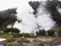 | 「硫黄谷」と聞いて、ちょっとそそられるものがあり、寄ってみました。名前の通り?すぐそばには、モウモウと吹き上げる噴気孔があり、硫化水素臭がいっぱいでした。 |