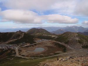 | ラストランを楽しもうとする人たちでいっぱいだった畳平。写真では分かりにくいかもしれませんが、乗鞍エコーラインは2km、乗鞍スカイラインは4kmほど渋滞しており、畳平の駐車場まで3時間30分ほどかかってしまいました。 せっかく畳平まで来たのだから少し歩こうと思いましたが、乗鞍岳までは片道90分。そこまで歩く元気はなかったので、乗鞍岳手前の富士見岳まで歩きました。なまった体にはちときつかったですが、駐車場からは見ることのできない素晴らしい景色に、しばし見とれていました。 来年からはマイカーを使うことができなくなり、気軽に訪れることはできなくなるのは残念ですが、これもこの素晴らしい自然を守るためと思えば仕方ないことなのかも知れません。 |