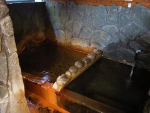 | 浴室はそんなに広くはないものの、普通の湯船の他に砂ね湯、石ね湯、水風呂、蒸し風呂があります。浴室に入って驚いたのが、湯量のものすごさ。本当にドバドバと大量の湯がかけ流しになっています。ちょっと熱めの湯で、わずかに白っぽく濁りがあります。飲んでみると、しっかり炭酸を感じるものでした。 寝湯は2つありますが、砂ね湯は文字通り、湯船の底が砂になっています。砂が身体にあたる感触がよかったです。石ね湯の方は湯温がわずかに低く、長湯しやすい湯温でした。 |