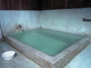 | 浴室はコンクリート造りの湯船が1つあるだけのシンプルな造りです。5〜6人が浸かることのできる湯船には湯畑の湯があふれています。湯畑では湯の花が舞っていますが、この湯は無色透明。湯の花は湯畑で取ってしまうからでしょうか? 草津の湯は熱い!という先入観があるのですが、先に入られた方が調整してくださったのか、適温で入りやすかったです。けっこうつるつるする湯ですが、舐めてみるととても酸っぱいのですが、レモンのようなさわやかさがありました。でも、目に入るとしみて困りました。お気をつけ下さい! |