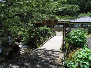 | 大滝温泉の少し先に七滝温泉があります。温泉にお抹茶を入れた「お抹茶風呂」で有名なつりばし荘を訪れてみました。 フロントは新館にあり、ここで入浴料を支払います。新館にも浴室がありますが、日帰り入浴は吊り橋を渡って行く本館だけのようです。新館は鉄筋のきれいな建物ですが、旧館は「猪の館」と呼ばれておりちょっと古めかしい感じ。「猪の館」の手前に「お抹茶風呂」があります。こちらは再び吊り橋を渡って行く貸切の露天風呂となっています。宿泊客も別料金とのことでちょっとハードルが高いですが、どのようなものか興味津々ではあります。 |