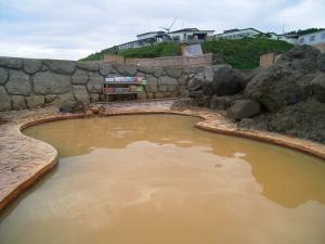 | 有名な海辺の露天風呂です。以前は夕方まで日帰りで利用することができましたが、現在は日帰りは16時までとなっています。したがって海に沈む夕日を見たければ泊まりで訪れるしかなくなりました。でも、冬なら日没が早いから16時でも夕日が見れるかもしれません。もちろん海が時化ている時などは利用することはできません。 以前は混浴だった海辺の露天風呂は2つに仕切られ、混浴と女性専用となっています。この露天風呂に浸かるために訪れる人が多く、いつもたくさんの人で賑わっています。その中でもやはり夕暮れ時が一番混んでいます。今回は残念ながらちょっと曇っていて日本海に沈む夕日を望むことはできませんでしたが、潮風に当たっての湯はとても気持ちよかったです。 |