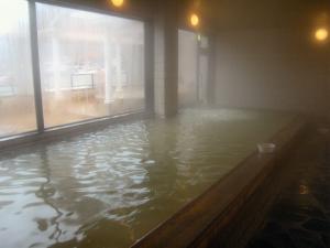 | 内湯は20人ほどが浸かれる大きさの湯船でうぐいす色の湯が溢れています。ちょいぬるめの湯です。独自源泉のようです。 | ![]() |