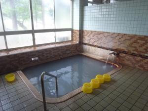 | 浴室は2つあるのですが、なんと2つの源泉が別々に利用されているのです。したがって、浴室は男女別になってはいますが、空いている方に男女の札を出して自由に浸かることができるようになっているのです。今回も時間があるなら、両方浸かって行ってくださいとのことだったので、ありがたく両方の湯に浸からせていただきました。 まずは奥にある浴室の湯に浸かりました。元々は1つの浴室だったものを2つに仕切ったように思える造りです。湯は少し鶯色を帯びた濁り気のある湯。ちょっとアブラ臭がします。そして湯の中には白と黒の消しゴムのような湯の花が舞っています。適温でちょっと堅めの湯でした。 単純温泉 44.2度 |