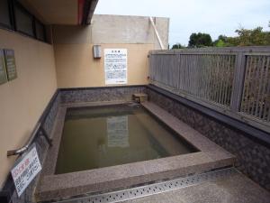 外には7〜8人が浸かれる源泉が注がれているという露天風呂があります。こちらはちょっと黄色みを帯びた色が付いています。湯を口に含むと海際の温泉だからか、とても苦しょっぱい湯でした。 |