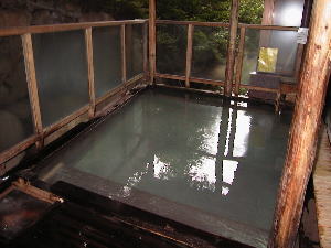 内湯はかなり熱めの湯でした。案内には、体を慣らす意味からも少しぬるめの露天風呂からはいるように書いてありました。湯は無色透明なのですが、湯船の底に湯の花がたまっており、体を湯に入れると、湯の花と呼ばれるように、白く濁ってきました。 |