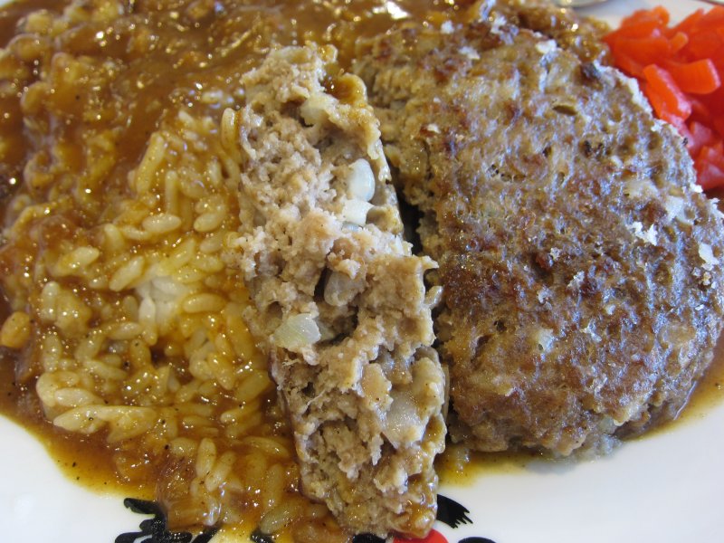 カレーはかなりの盛り。ボリュームありますね。 ルーは普通のカレーよりも色味が違いますね。ハヤシライスって感じかな。でも、味はカレー。しかも、後からピリッと辛みが口の中に広がるタイプ。それほど強い辛みじゃないけど、けっこうあとに残るタイプだね。 ハンバーグもそれなりに大きく、玉ねぎも入っています。少し柔らかめで肉肉しい感じはしないかな。ごちそうさまでした。 (26.1) |