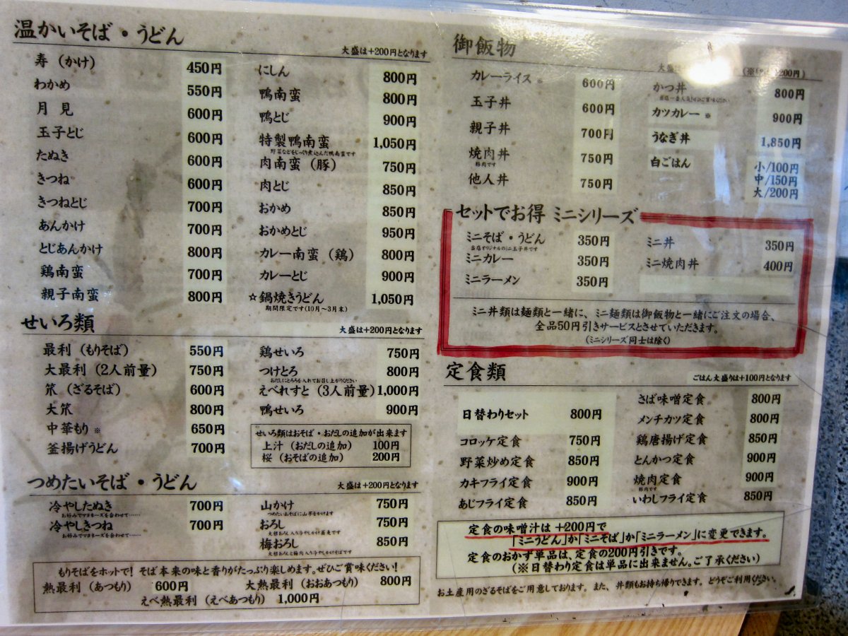 メニューはそば・うどんから始まってラーメン系、丼物、定食とたくさんあって何を食べようかと迷ってしまいます。日替わりサービスもありますね。で、選んだのは、一番人気というかつ丼\800をね。 |