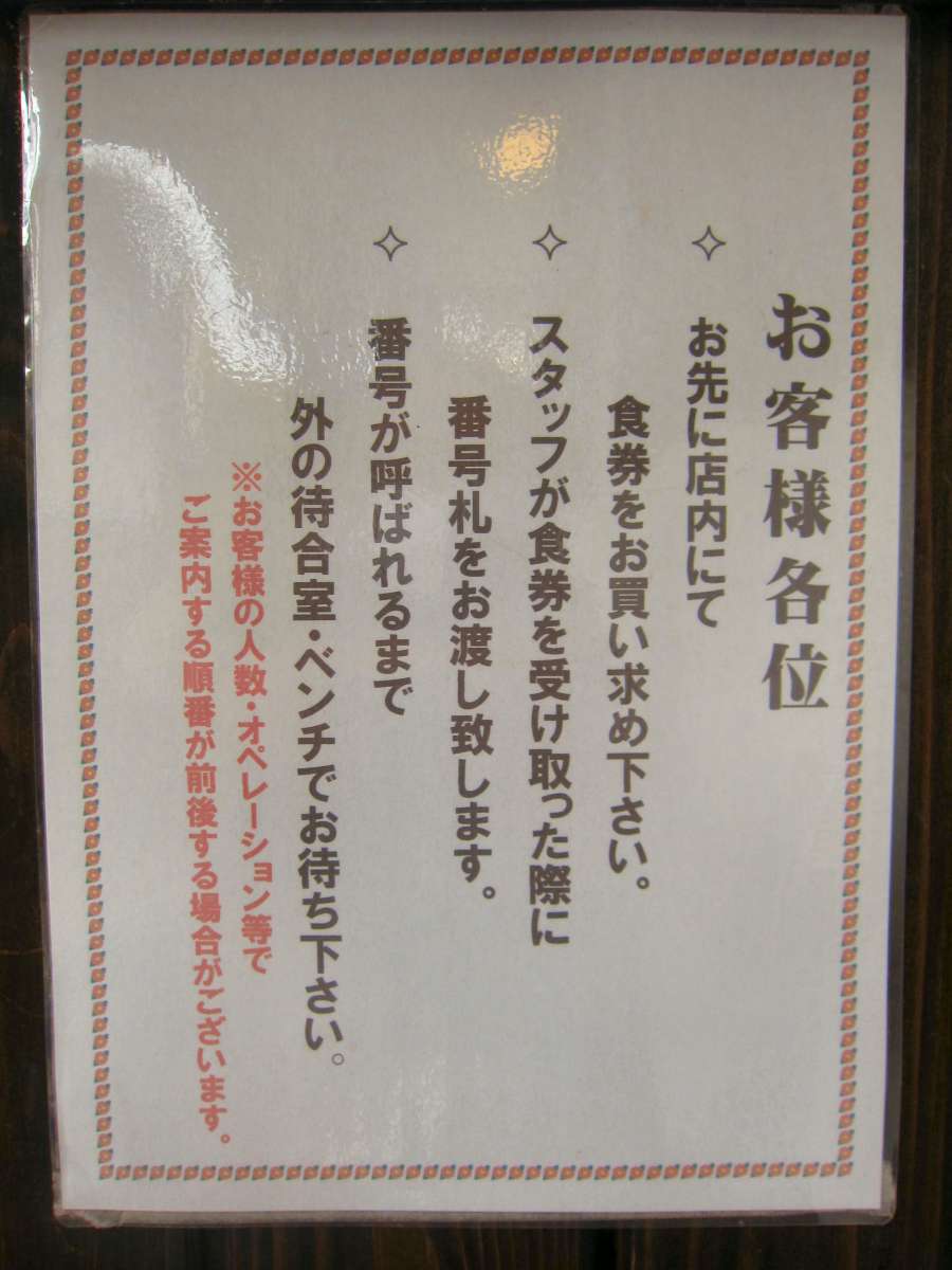 こちらの店は人気店で、かなりの待ち。でも、並びのルールがキチンと明示されているので、分かりやすいですね。まずは、券売機で食券を買い、店の方に渡すと、番号札を貰えるのよ。そして、外待ちしてて、順番が来ると店内待ちの場所に移動。そして、席が空くと席に案内されるっていう仕組み。30分くらい並んだかな。 |