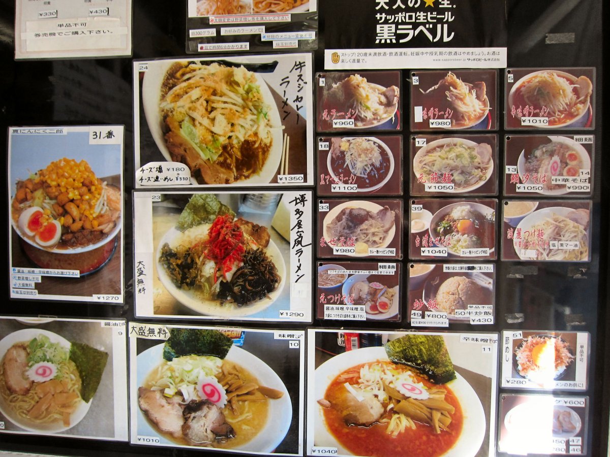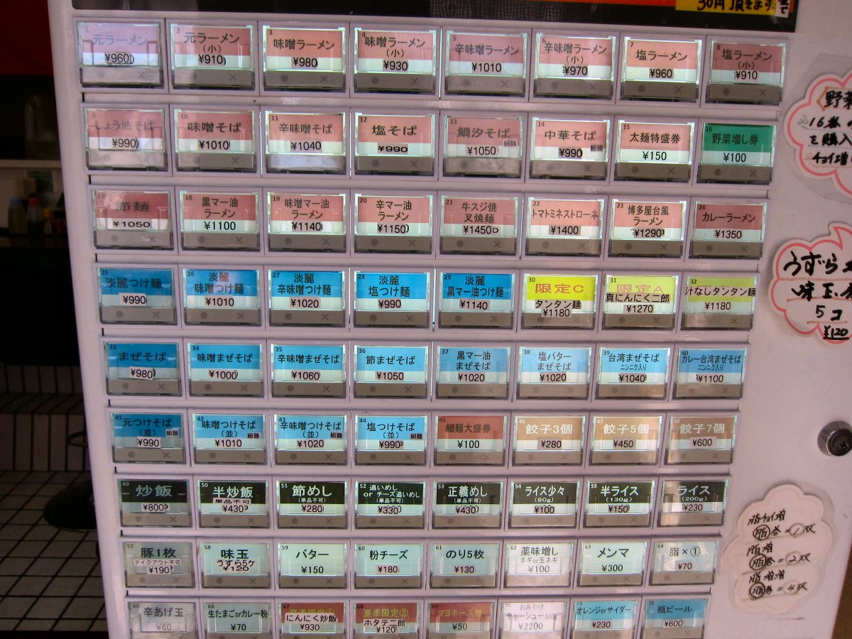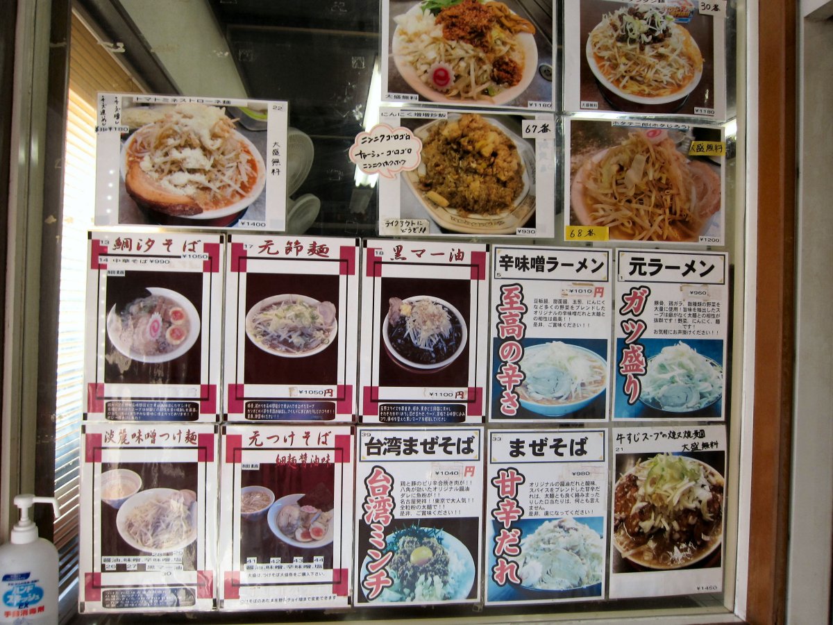 注文は入口の券売機で食券を買う方式。二郎系の元ラーメン以外にもたくさんのメニューが並んでいて、迷ってしまいます。とはいえ、基本の元ラーメンを食べようかと… でも、食べ切れるかな?と、思って元ラーメンの小にしたんだけど、聞いたら、小は麺量120gとのことでけっこう少なめとのことなので、普通にしてもらいました。 |