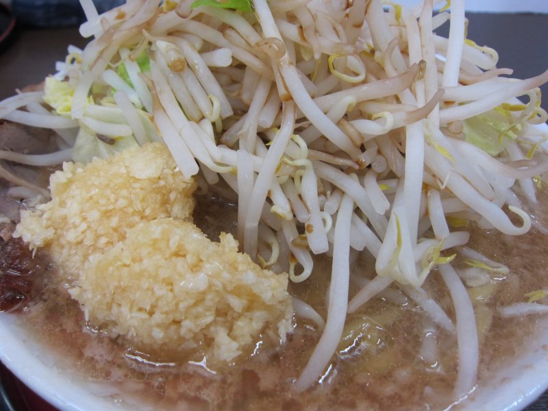 そう待たずに運ばれたラーメンは、けっこう大盛りの野菜(もやしとキャベツ)はそれなりの量なんだけど、にんにくのボリュームに驚き!アイスクリームをすくうアイスクリームディッシャーですくったような塊が2つもあって驚き。かなり臭いそうだね(^^ゞ |