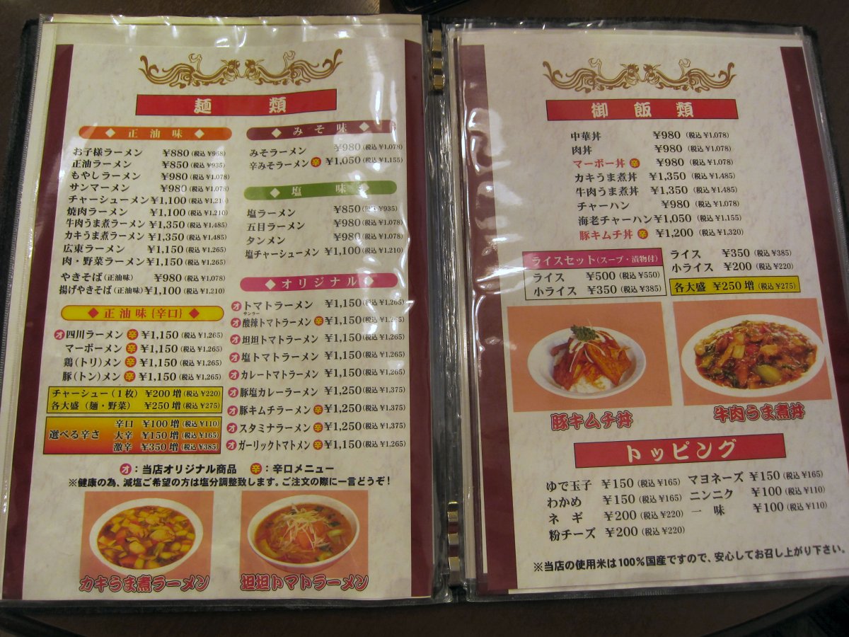 沼田I.C.から金精峠に向かってしばらく走ったところにある中華料理屋さんです。以前温泉仲間と群馬の温泉めぐりをしていた時、沼田に面白そうなラーメン屋さんがあると聞いて探したお店です。訪れてみると確かに変わったメニューが並んでいます。もちろん普通のラーメンや料理もたくさんあり、地元の方でとても賑わっているお店です。 |