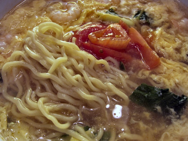すぐに運ばれたラーメンは、トマトラーメンと違って透明感ある溶き玉子のスープにトマトや海老、ほうれん草などが浮かんだもの。 まずはスープを啜ると、トマトの酸味を感じるもの。これがなかなか癖になりそうな感じ。麺は中くらいのもの。ちょいボリューム感は無かったのが残念かな。ごちそうさまでした。 (25.11) |
