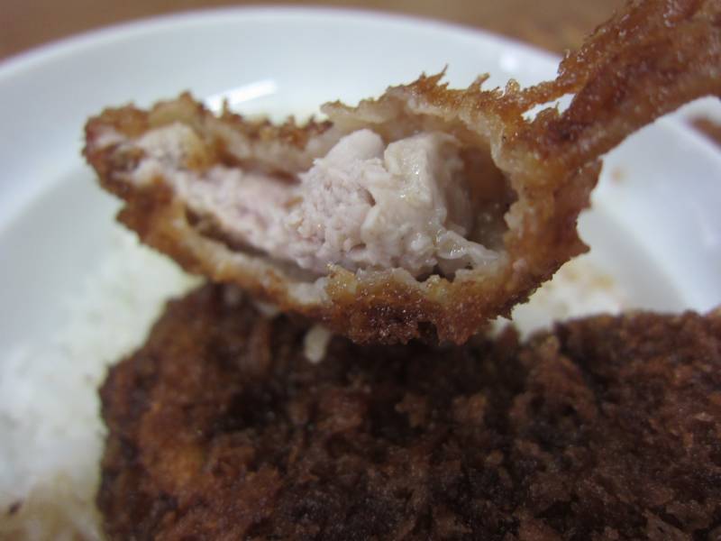 蓋を取るとヒレとしては大きめなかつが3枚載ったもの。みそ汁が付いてないのは残念だな(別売)。 でも、秩父のわらじかつ丼みたいに薄めだけど大きなかつではないですね。ヒレだからかな? |