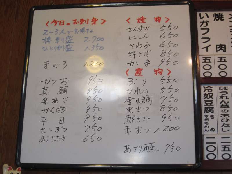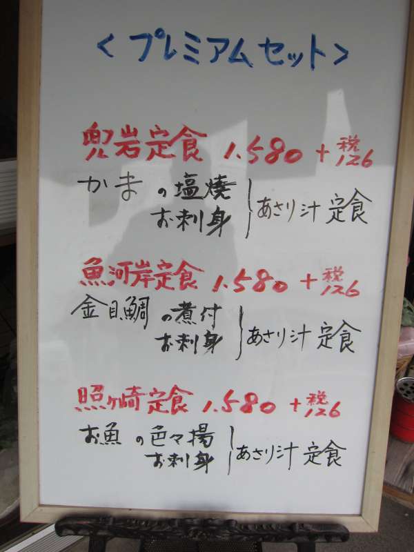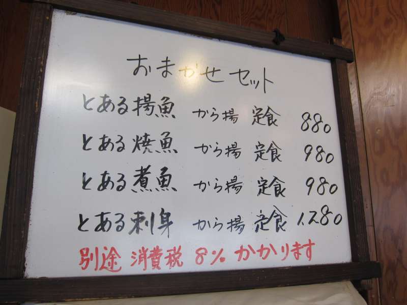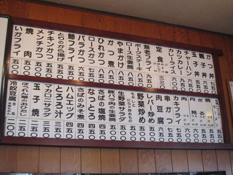 注文は店員さんに直接頼む方式です。配膳口上に掲げられたメニューは、ラーメンやそばから始まりかつ丼、カレーライスなど、街道沿いの食堂としては幅広いメニューとなっています。ちなみにこちらのメニューは基本単品で、ご飯を食べる時は、ご飯、味噌汁などがついた定食セット\330を注文するようになっています。今回は何を食べようかと悩みましたが魚が売りのようなので、金目鯛の煮付け\750に定食セット\330をいただくことにしました。