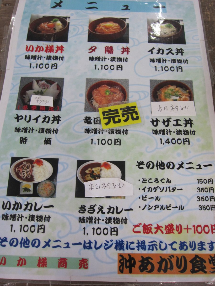 こちらは現金先払い方式。メニューは漁獲によって変わるので、いつも同じものを食べられるとは限らないみたい。でも、いかのメニューがメインですね。この日は丼物の3つしかなかったので、夕陽丼\1100をね。 |