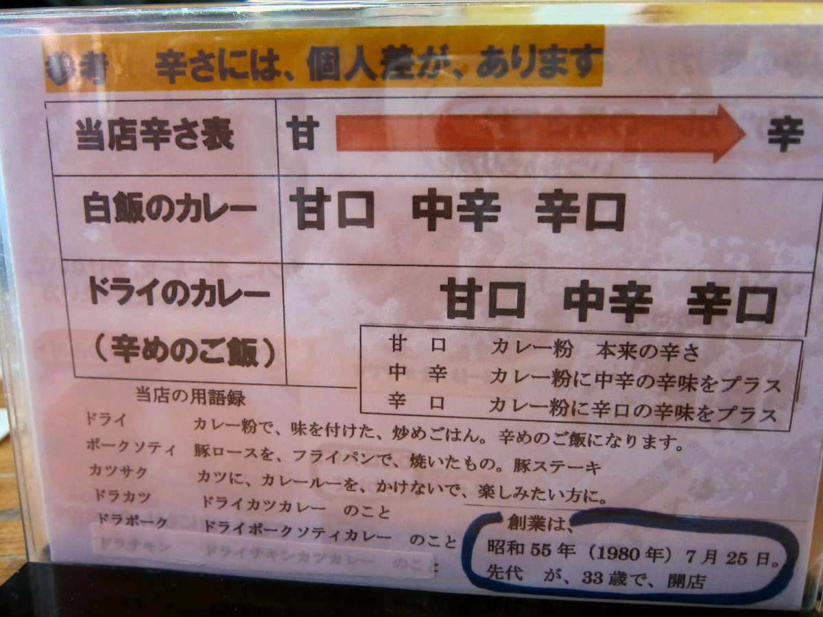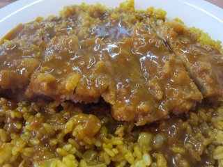運ばれたカレーは、真っ黄色なドライカレーにかつを載せ、ルーをかけたもの。 まずはドライカレーを一口。けっこう辛めですね。かつは薄め。ちょい物足りないかな。ルー自体はそんなに辛さはないかな。ドライカレーの辛みで食べきるのに時間かかっちゃいました。ごちそうさまでした。 (25.10) |