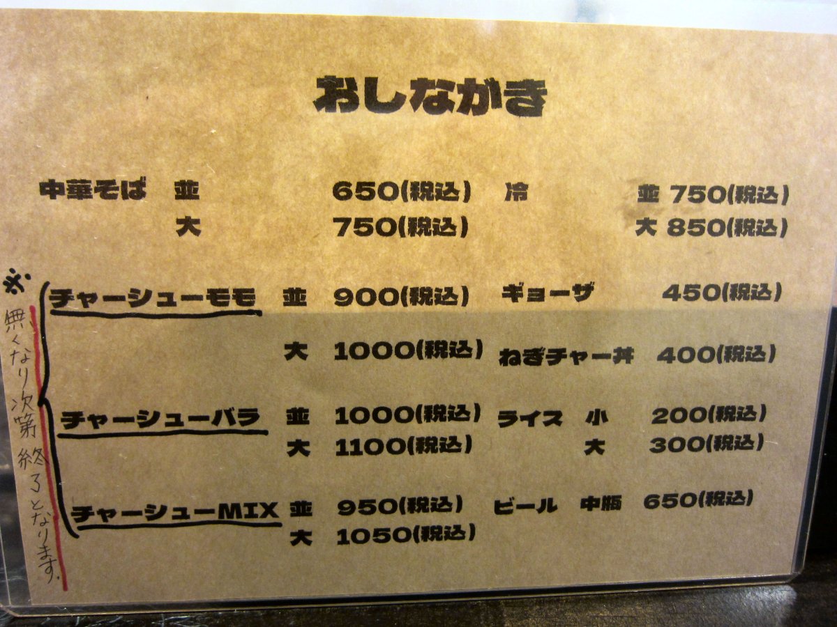 メニューを見ると、普通?の中華そばとチャーシュー麺があります。しかも、チャーシューはもも肉とバラ肉があり、どちらかとMIXを選ぶことができます。今回はMIX\950でお願いしました。